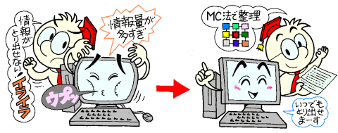 今や社員一人にパソコン一台は当たり前の時代となりました。パソコンの中の情報量は増え続けていきます。また、仕事別にいろんなソフトが組み込まれています。情報量が少ない時は、探すのも組み変えることも苦になりませんが、やがて収拾がつかなくなっていきます。例え不要な情報があったとしても、メンテナンスが充分にできず、情報の拡散は加速されます。いつでも自分の欲しい情報が取り出せるように、パソコンの中をゴミ掃除をしながら整理しておくことです。この問題はMC法を使うことで解決できます。古い情報も時系列で集めて眺めれば、要・不要のチェックもできます。つまり情報の棚おろしもできるわけです。